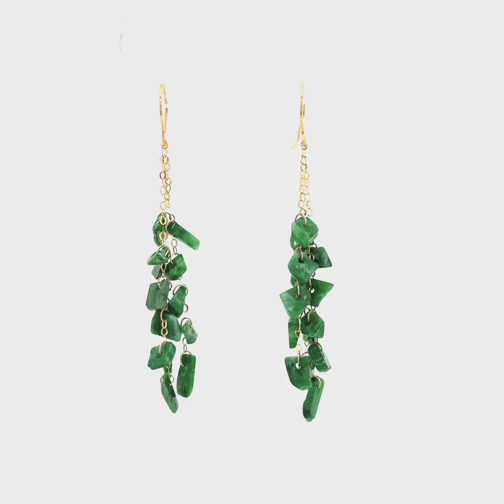These playful geometric jade drops are a trio of verdant stones suspended from delicate 14k yellow gold wires, creating an effortless waterfall effect. Each pair is uniquely crafted, showcasing the natural variations in jade's soft green hues. Perfect for adding an artful touch to any look without trying too hard.