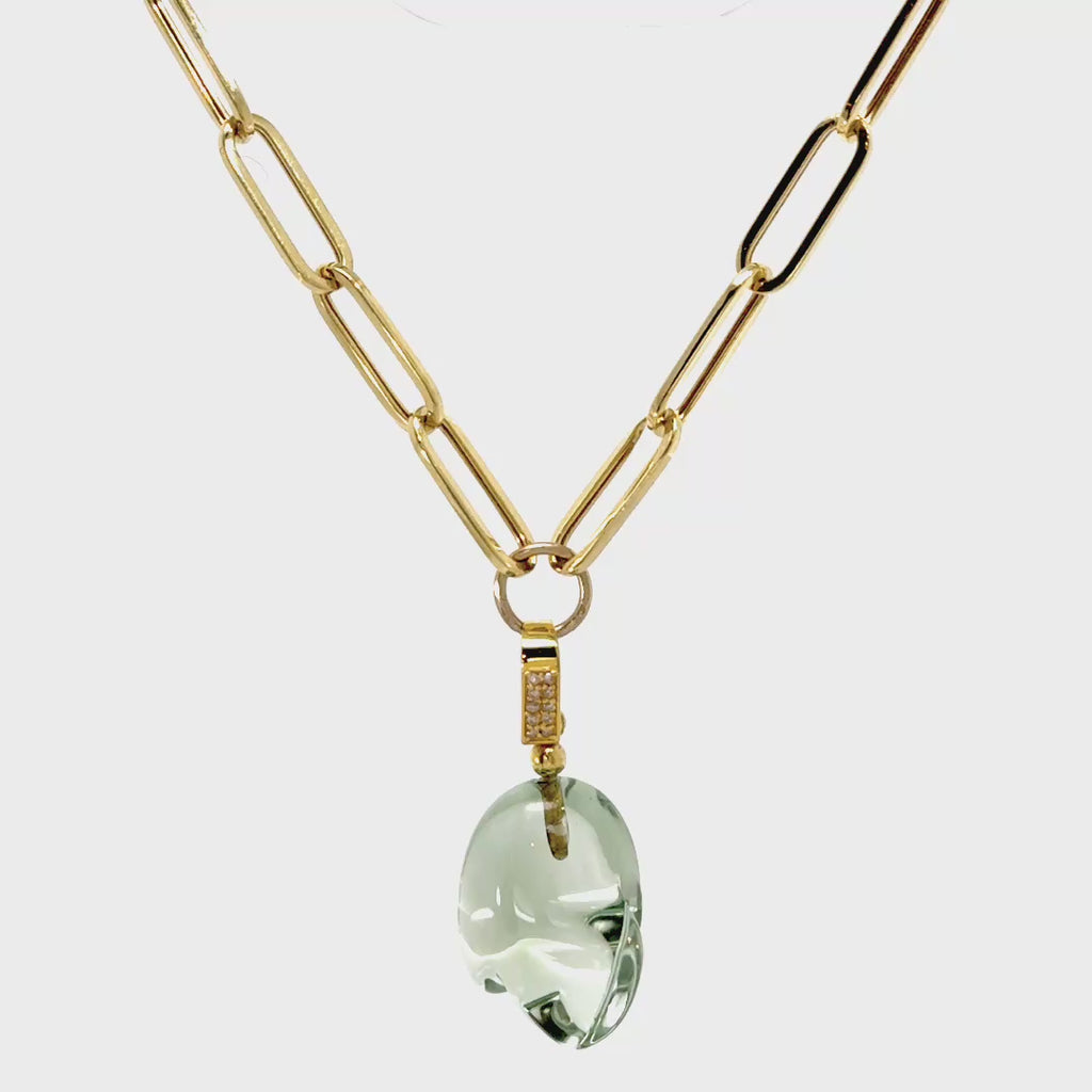 Combining rich dark green tourmaline or green amethyst with an intricate mix of drawn cable and Rolo chains, topped with a glittering diamond bail, this piece demands attention. Perfect for those bold enough to embrace their authentic style—a contemporary design that celebrates confidence and unapologetic elegance.