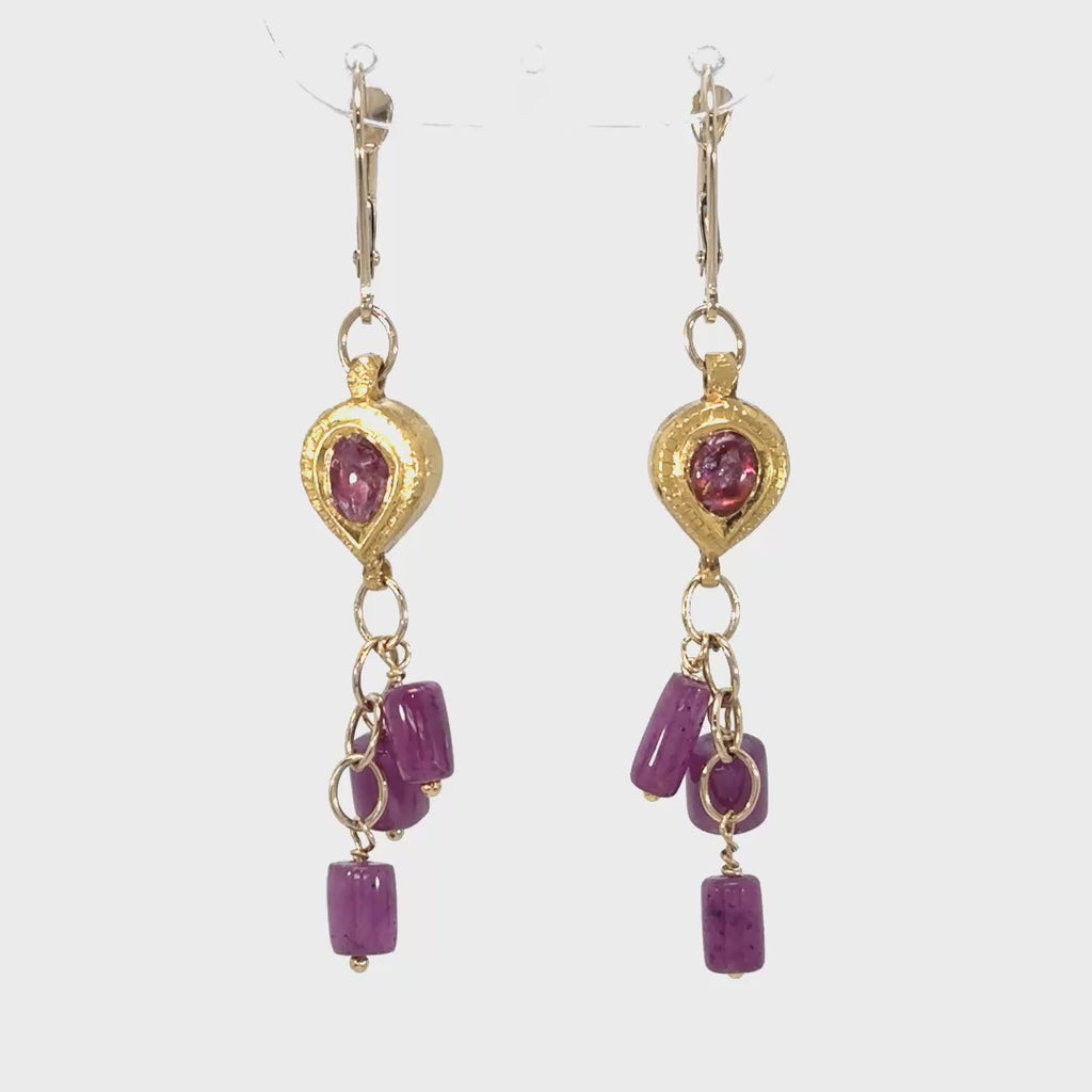 These elegant earrings showcase a refined interplay of gemstones and precious metals. Delicate ruby segments dangle gracefully from a 14k gold cable chain, suspended beneath a luminous pink tourmaline polki secured in 18k gold. The sophisticated design is completed with a secure 14k gold lever back closure, creating a harmonious blend of vibrant hues and timeless craftsmanship.