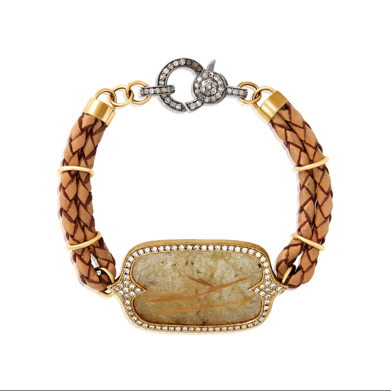 Pave Diamond Golden Rutilated Shield Leather Bracelet