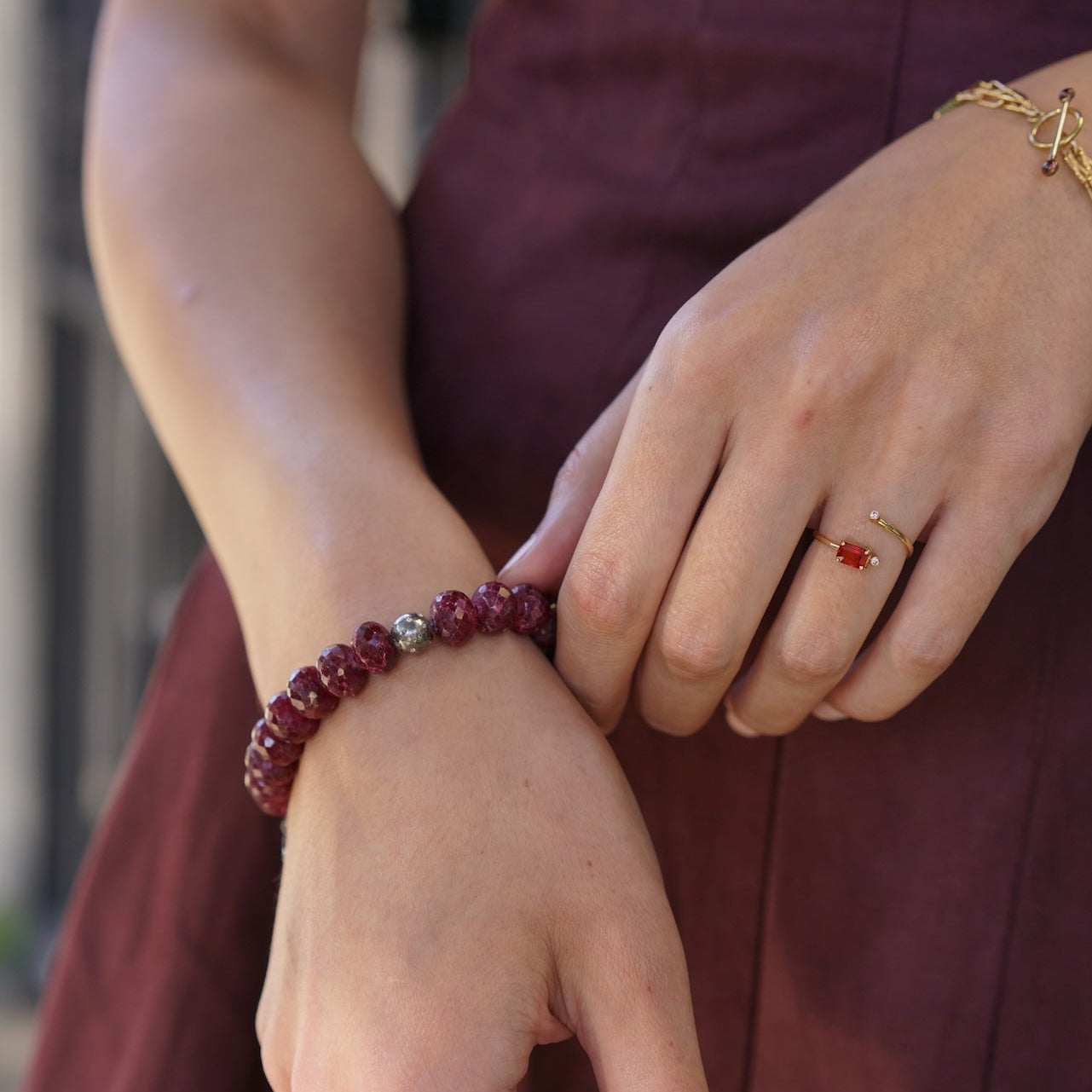 Ruby Beaded Pave Diamond Charm Stretchy Bracelet