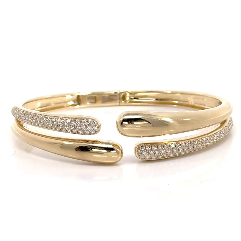 Discover understated luxury with this 14k gold double bangle, where pavé diamonds meet lustrous gold in perfect balance. The ingenious hinged center clasp grants seamless access while keeping your bracelet securely fastened. Engineered to maintain the diamond's prominent placement on your wrist, this piece marries timeless elegance with everyday comfort and reliability.