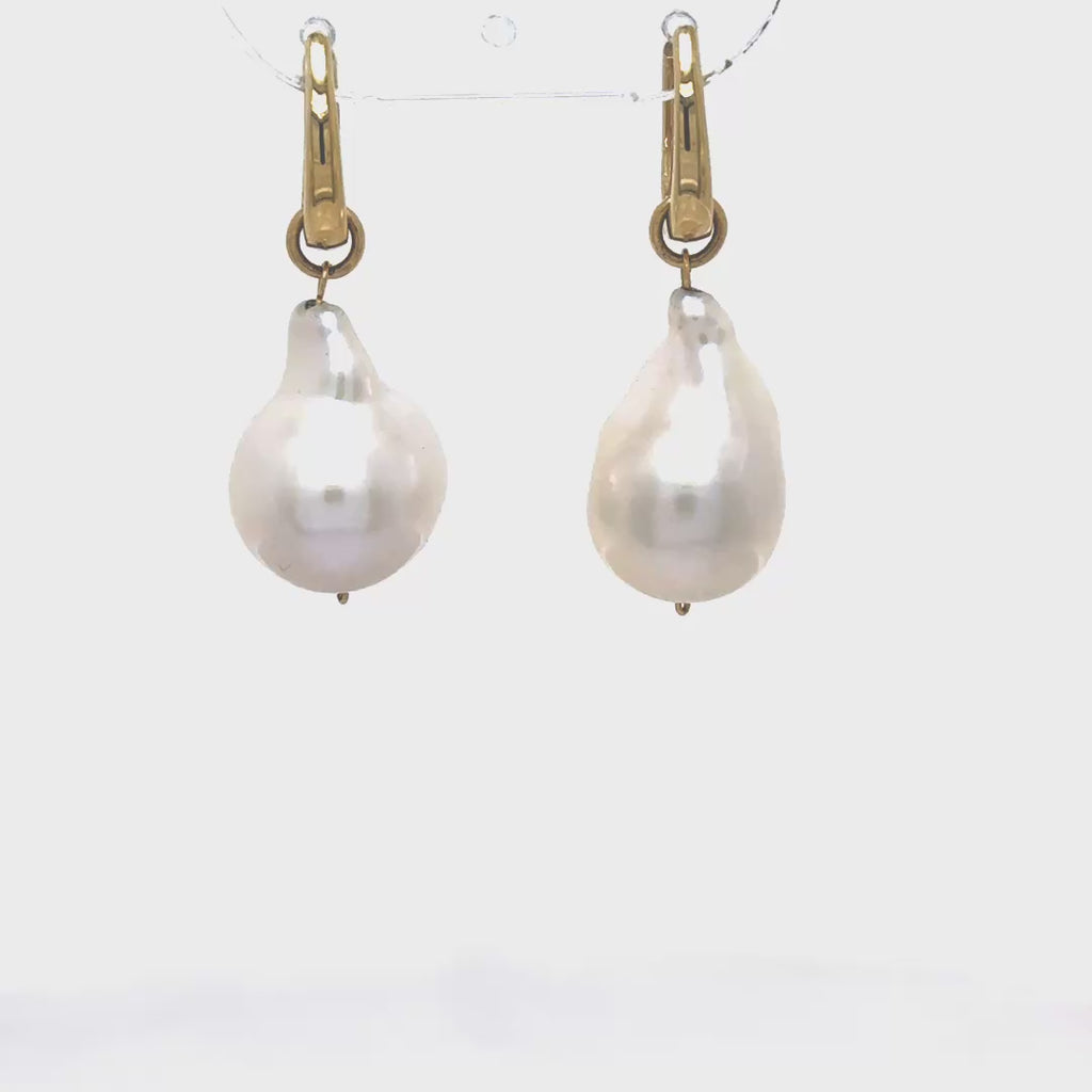 These 14k gold oval hoops feature a unique drop of irregular natural baroque pearl, combining elegance with an organic touch.