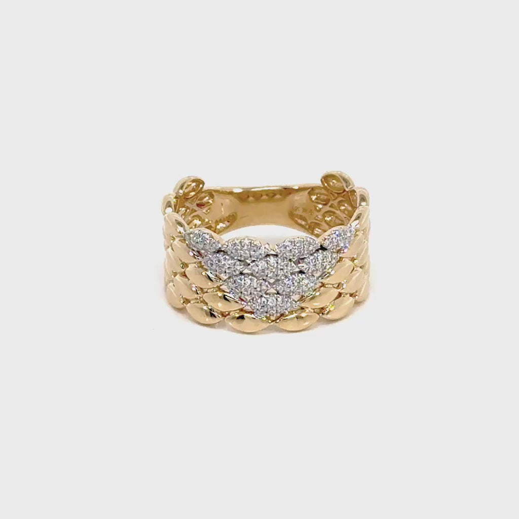 Dare to make a statement with this bold 14k gold ring, where intricate braided texturing meets radiant diamond shimmer. A wide band that commands attention and refuses to blend in—perfect for those who wear their confidence visibly.