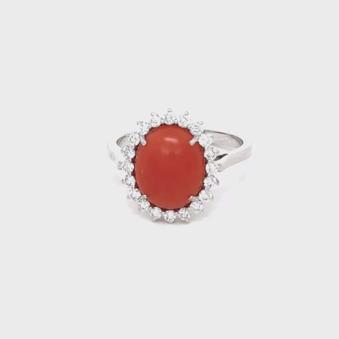 Dare to stand out with this audacious coral and diamond ring. A luminous oval coral takes center stage, encircled by a dazzling array of diamonds that amplify its bold presence. Anchored in luxurious 14k white gold, this piece celebrates those who refuse to play it safe. Unmistakably unforgettable.