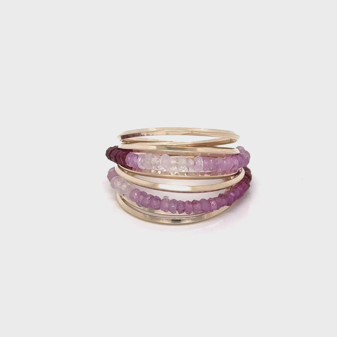 This sophisticated ring combines a bunch of gold-filled square bands with a carefully curated gradient of rubies, creating a striking interplay of form and color. The geometric precision of the band complements the warm, shifting tones of the gemstones, resulting in a piece that demonstrates both refined craftsmanship and visual depth.