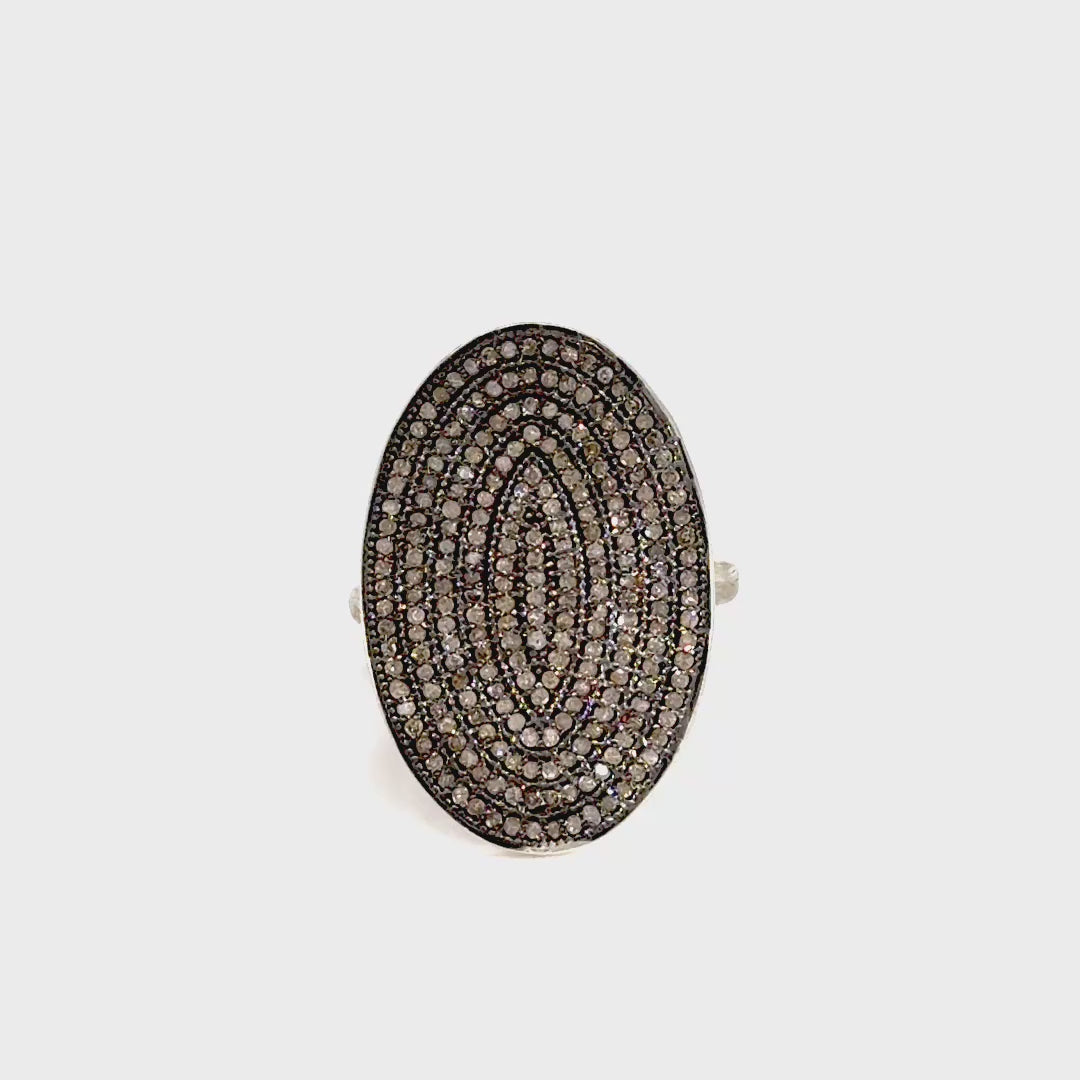This striking ring features a substantial oval shield adorned with pavé diamonds, expertly set in sterling silver and mounted on a gracefully textured bamboo band. The combination of brilliant stone work and organic metalwork creates a sophisticated piece that balances contemporary design with natural elegance.
