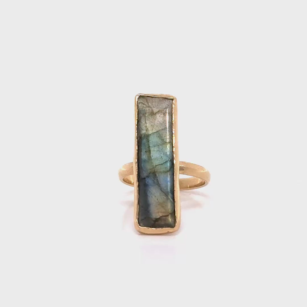Elongate faceted labradorite bezel set in 14k gold on a 2mm half round band