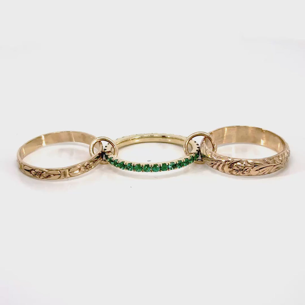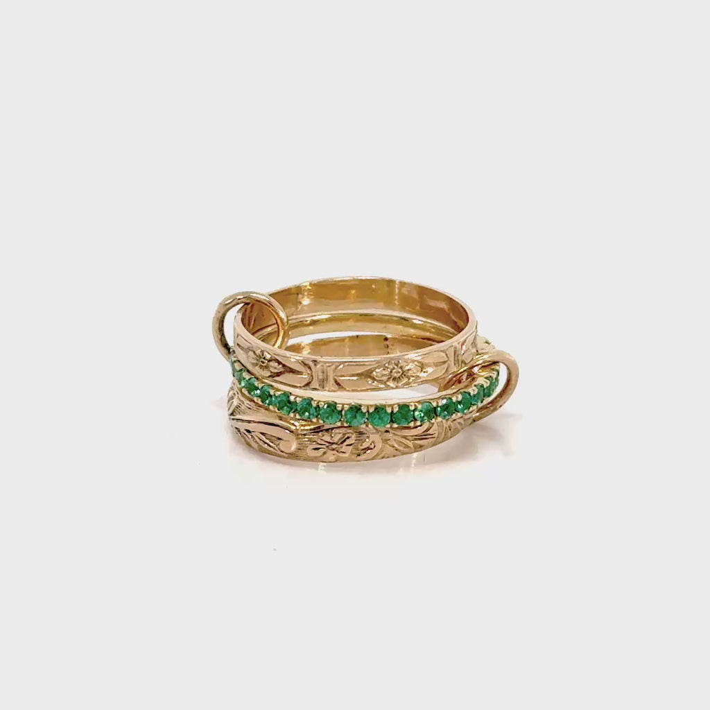 Two vintage floral pattern 14k gold ring with one emerald eternity ring