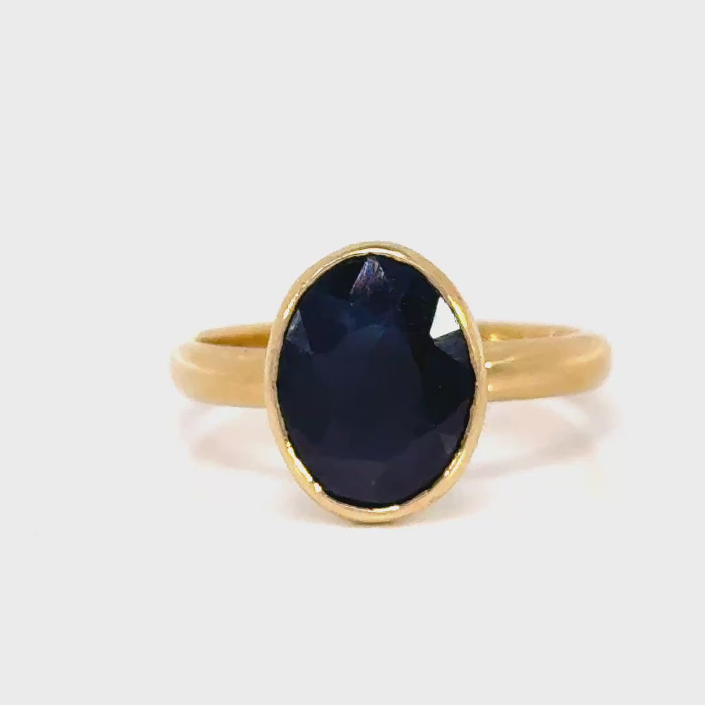 This timeless piece features a captivating deep blue sapphire beautifully showcased on a 14K gold band.